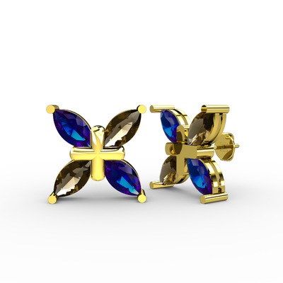 Lab safir ve dumanlı kuvars 18 ayar altın küpe