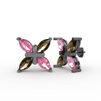 Pembe kuvars ve dumanlı kuvars 925 ayar siyah rodyum kaplama gümüş küpe