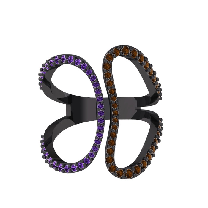 Ametist ve dumanlı kuvars 925 ayar siyah rodyum kaplama gümüş yüzük