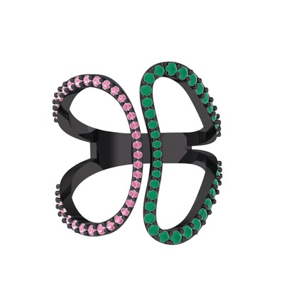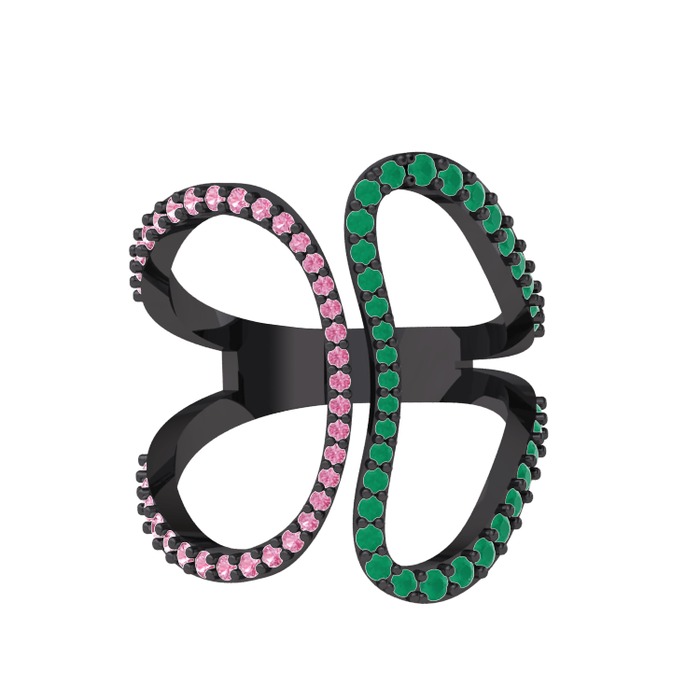 Pembe kuvars ve kök zümrüt 925 ayar siyah rodyum kaplama gümüş yüzük