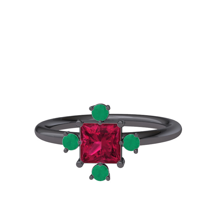 Rodolit garnet ve kök zümrüt 925 ayar siyah rodyum kaplama gümüş yüzük