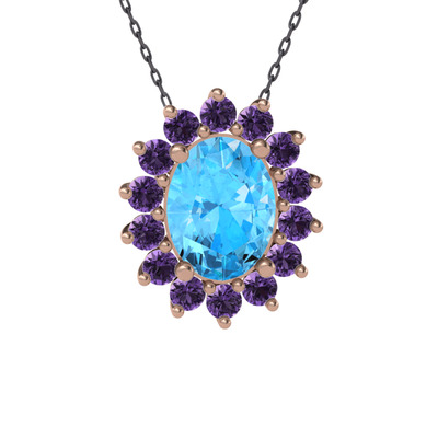 Akuamarin ve ametist 14 ayar rose altın kolye (40 cm gümüş rolo zincir)