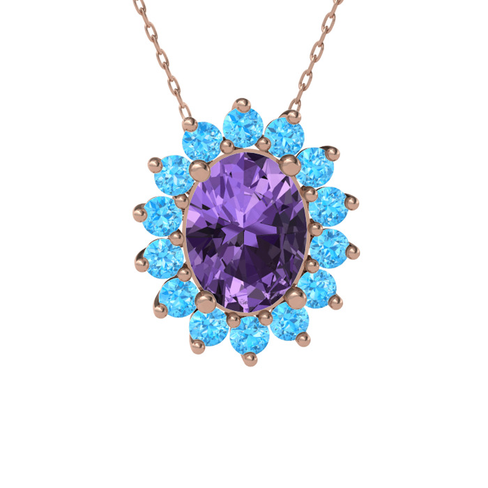 Ametist ve akuamarin 18 ayar rose altın kolye (40 cm rose altın rolo zincir)