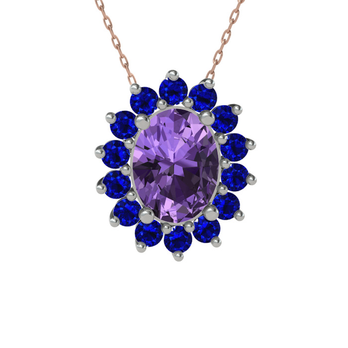 Ametist ve lab safir 14 ayar beyaz altın kolye (40 cm rose altın rolo zincir)