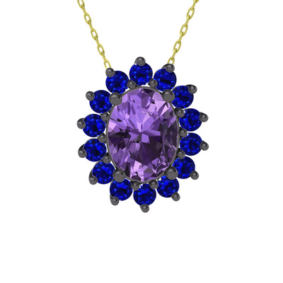Ametist ve lab safir 925 ayar siyah rodyum kaplama gümüş kolye (40 cm altın rolo zincir)