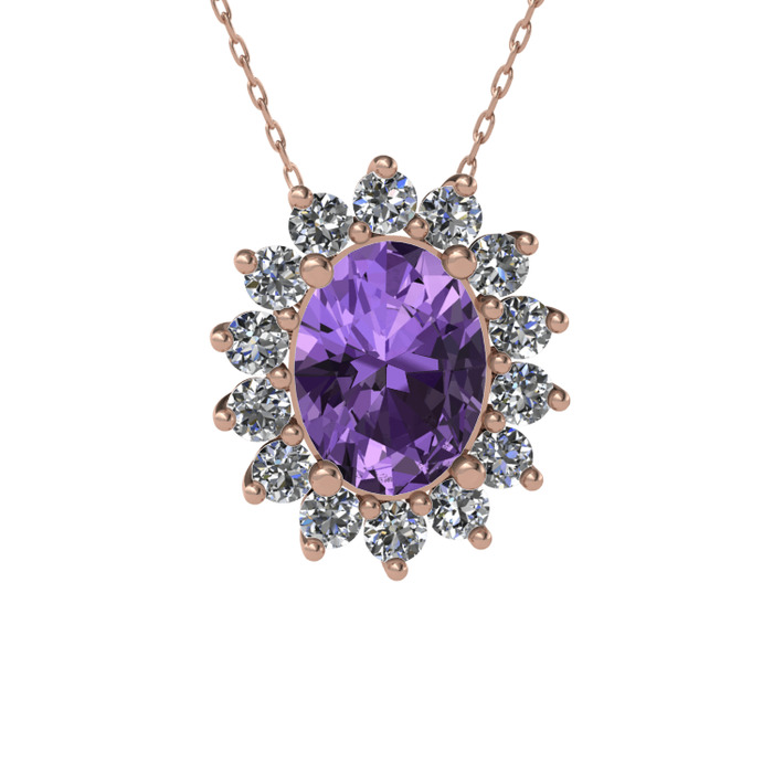 Ametist ve pırlanta 925 ayar rose altın kaplama gümüş kolye (0.504 karat, 40 cm rose altın rolo zincir)