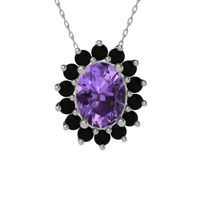 Ametist ve siyah zirkon 14 ayar beyaz altın kolye (40 cm gümüş rolo zincir)