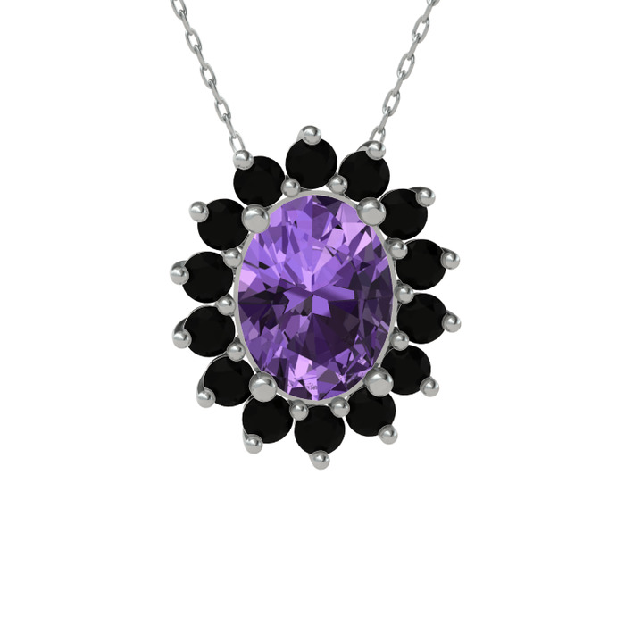 Ametist ve siyah zirkon 18 ayar beyaz altın kolye (40 cm gümüş rolo zincir)