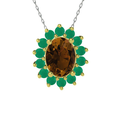 Dumanlı kuvars ve kök zümrüt 925 ayar altın kaplama gümüş kolye (40 cm gümüş rolo zincir)