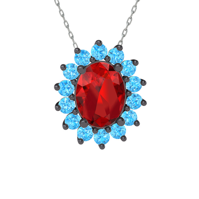 Garnet ve akuamarin 925 ayar siyah rodyum kaplama gümüş kolye (40 cm beyaz altın rolo zincir)