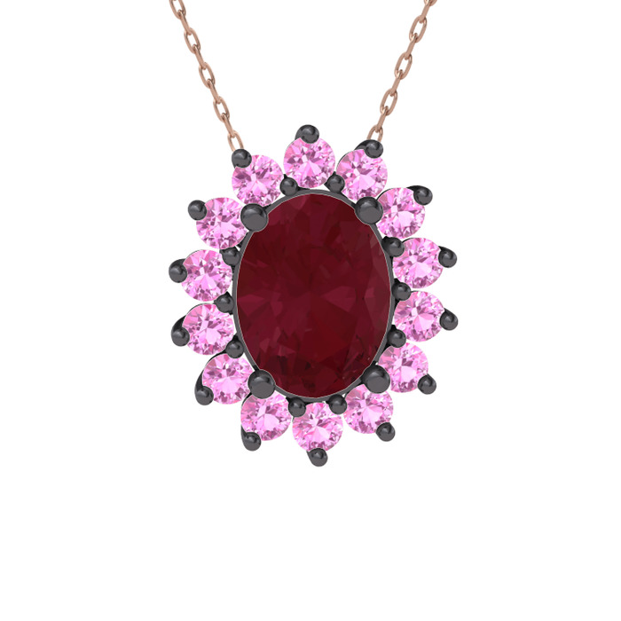 Kök yakut ve pembe kuvars 925 ayar siyah rodyum kaplama gümüş kolye (40 cm rose altın rolo zincir)