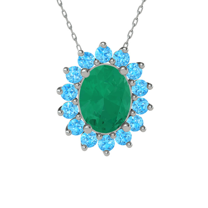 Kök zümrüt ve akuamarin 18 ayar beyaz altın kolye (40 cm gümüş rolo zincir)