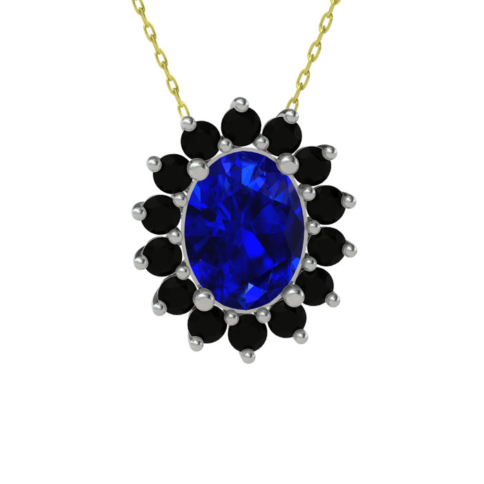 Lab safir ve siyah zirkon 18 ayar beyaz altın kolye (40 cm altın rolo zincir)
