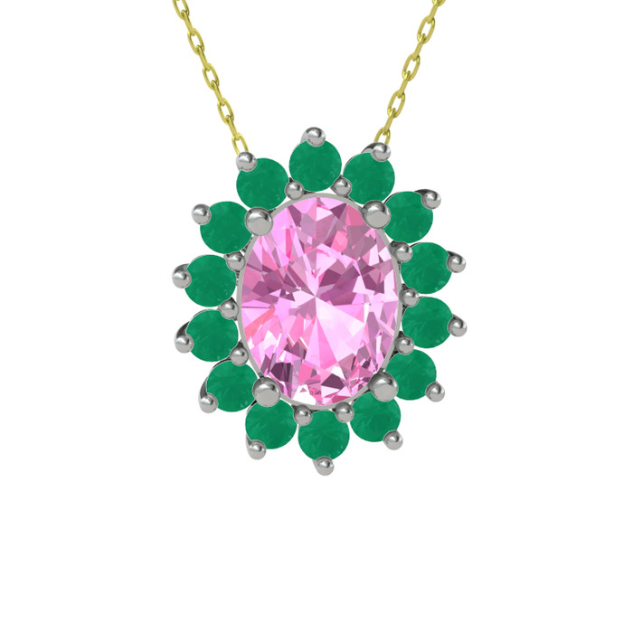Pembe kuvars ve kök zümrüt 925 ayar gümüş kolye (40 cm gümüş rolo zincir)