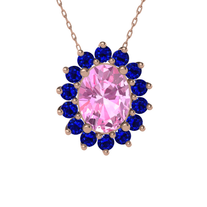 Pembe kuvars ve lab safir 18 ayar rose altın kolye (40 cm rose altın rolo zincir)