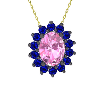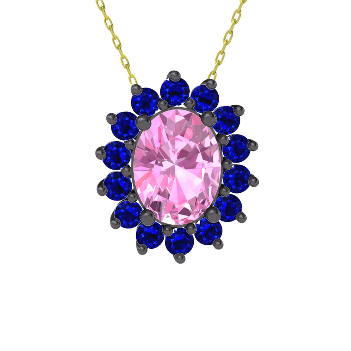 Pembe kuvars ve lab safir 925 ayar siyah rodyum kaplama gümüş kolye (40 cm altın rolo zincir)