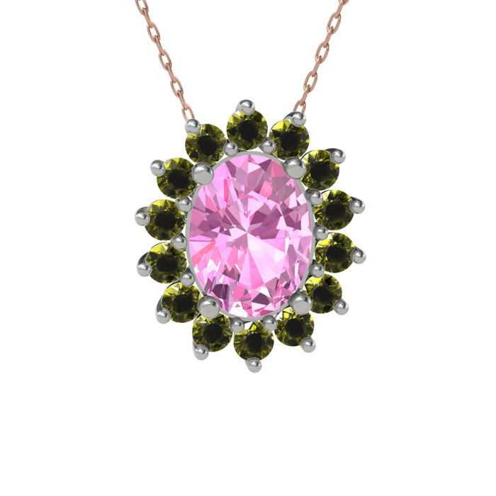 Pembe kuvars ve peridot 18 ayar beyaz altın kolye (40 cm gümüş rolo zincir)