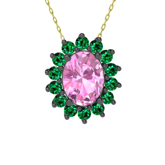 Pembe kuvars ve yeşil kuvars 925 ayar siyah rodyum kaplama gümüş kolye (40 cm altın rolo zincir)