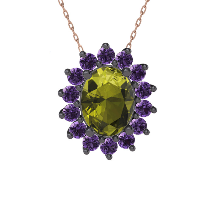 Peridot ve ametist 925 ayar siyah rodyum kaplama gümüş kolye (40 cm rose altın rolo zincir)