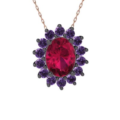 Rodolit garnet ve ametist 925 ayar siyah rodyum kaplama gümüş kolye (40 cm rose altın rolo zincir)