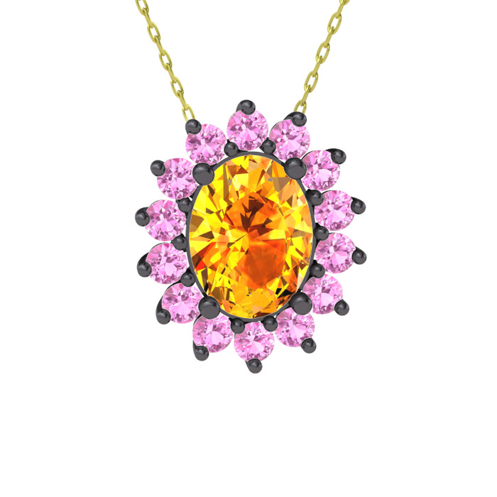 Sitrin ve pembe kuvars 925 ayar siyah rodyum kaplama gümüş kolye (40 cm gümüş rolo zincir)