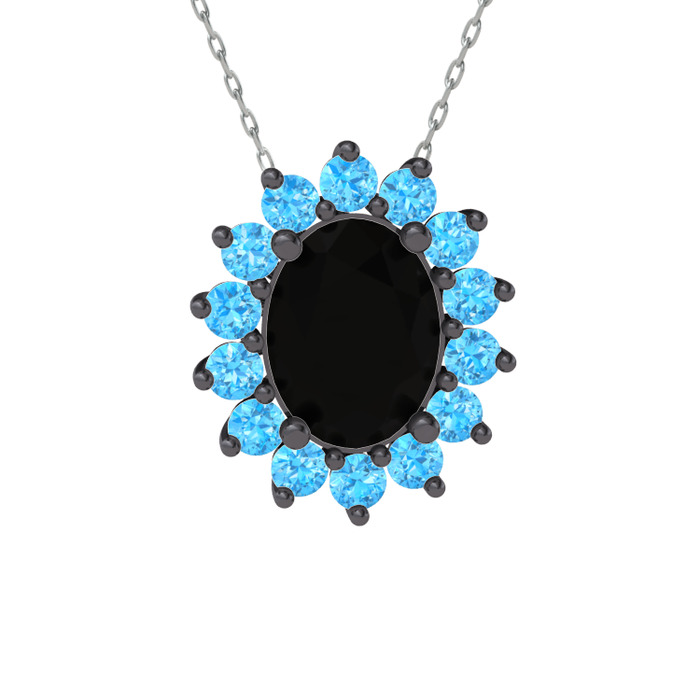 Siyah zirkon ve akuamarin 925 ayar siyah rodyum kaplama gümüş kolye (40 cm beyaz altın rolo zincir)