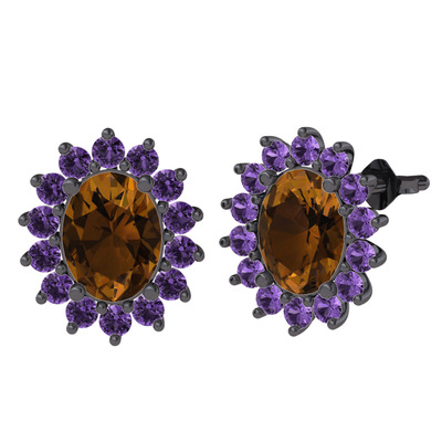 Dumanlı kuvars ve ametist 925 ayar siyah rodyum kaplama gümüş küpe