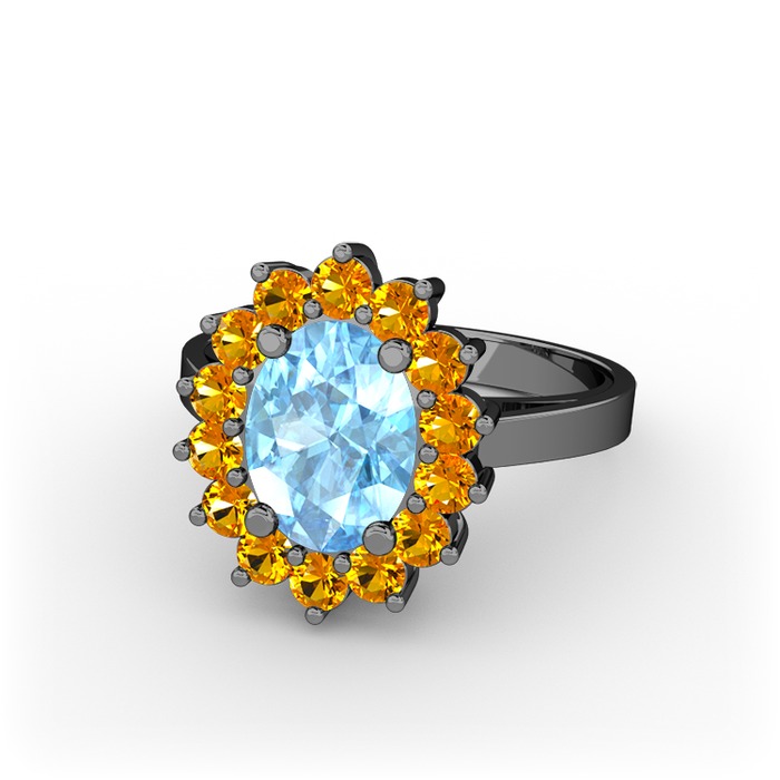 Akuamarin ve sitrin 925 ayar siyah rodyum kaplama gümüş yüzük