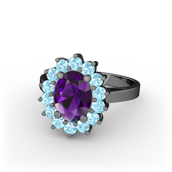 Ametist ve akuamarin 925 ayar siyah rodyum kaplama gümüş yüzük
