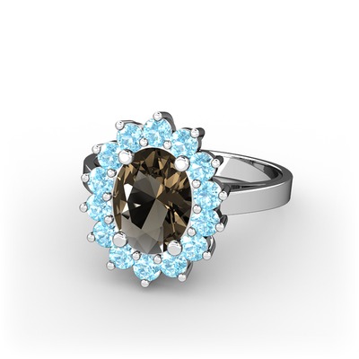 Dumanlı kuvars ve akuamarin 14 ayar beyaz altın yüzük