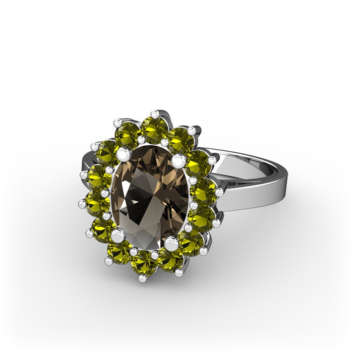 Dumanlı kuvars ve peridot 14 ayar beyaz altın yüzük