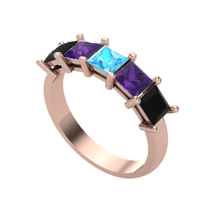 Akuamarin, ametist ve siyah zirkon 925 ayar rose altın kaplama gümüş yüzük