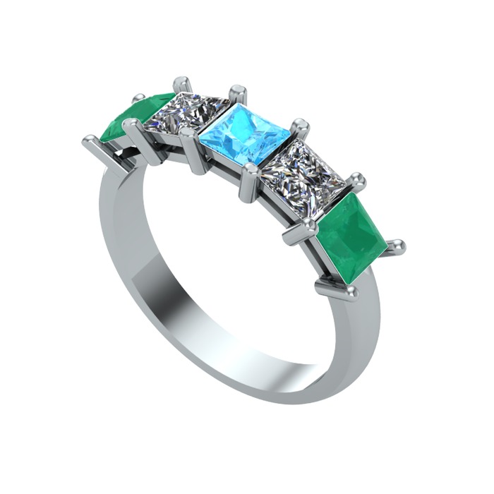 Akuamarin, pırlanta ve kök zümrüt 14 ayar beyaz altın yüzük (0.78 karat)