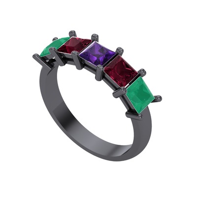 Ametist, kök yakut ve kök zümrüt 925 ayar siyah rodyum kaplama gümüş yüzük