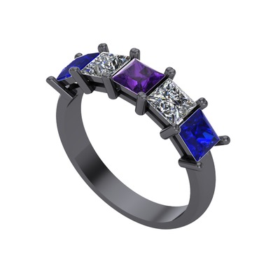Ametist, pırlanta ve lab safir 925 ayar siyah rodyum kaplama gümüş yüzük (0.78 karat)