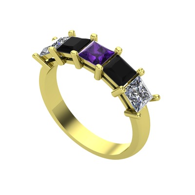 Ametist, siyah zirkon ve pırlanta 8 ayar altın yüzük (0.78 karat)