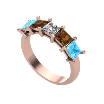 Beyaz zirkon, dumanlı kuvars ve akuamarin 18 ayar rose altın yüzük
