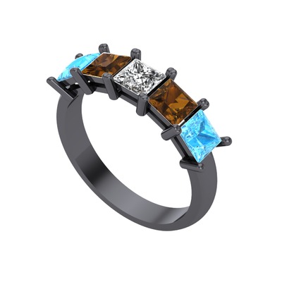 Beyaz zirkon, dumanlı kuvars ve akuamarin 925 ayar siyah rodyum kaplama gümüş yüzük