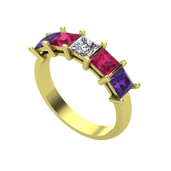 Beyaz zirkon, rodolit garnet ve ametist 14 ayar altın yüzük