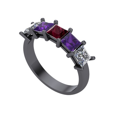 Kök yakut, ametist ve pırlanta 925 ayar siyah rodyum kaplama gümüş yüzük (0.78 karat)