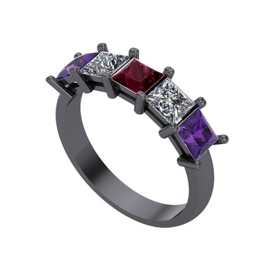 Kök yakut, pırlanta ve ametist 925 ayar siyah rodyum kaplama gümüş yüzük (0.78 karat)