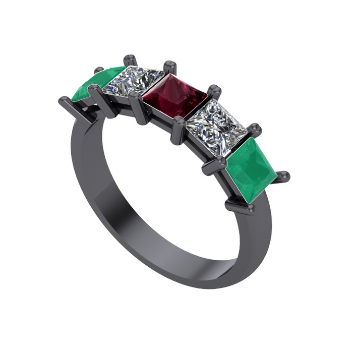 Kök yakut, pırlanta ve kök zümrüt 925 ayar siyah rodyum kaplama gümüş yüzük (0.78 karat)