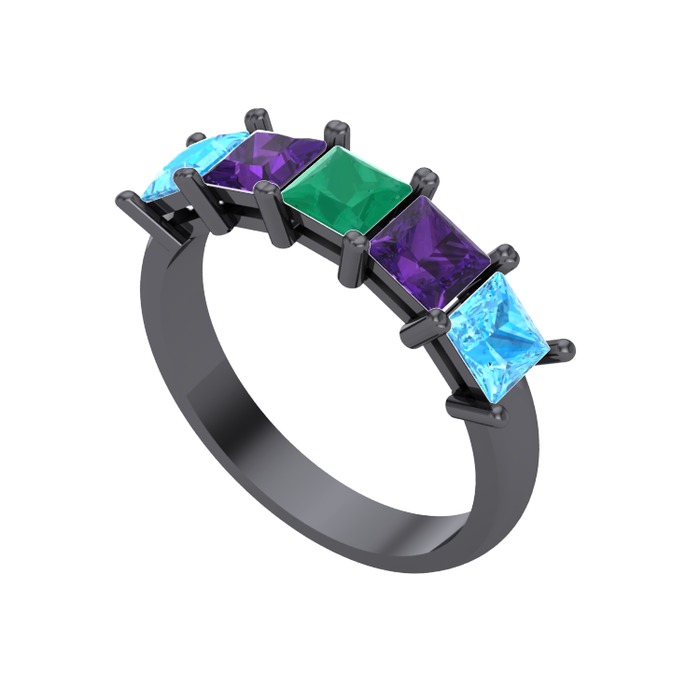 Kök zümrüt, ametist ve akuamarin 925 ayar siyah rodyum kaplama gümüş yüzük