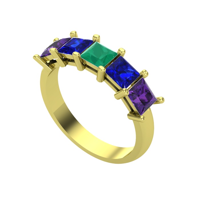 Kök zümrüt, lab safir ve ametist 14 ayar altın yüzük