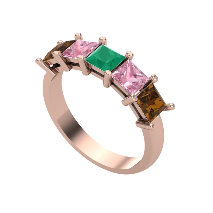 Kök zümrüt, pembe kuvars ve dumanlı kuvars 18 ayar rose altın yüzük