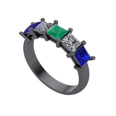 Kök zümrüt, pırlanta ve lab safir 925 ayar siyah rodyum kaplama gümüş yüzük (0.78 karat)