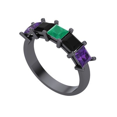 Kök zümrüt, siyah zirkon ve ametist 925 ayar siyah rodyum kaplama gümüş yüzük