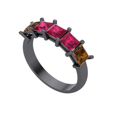 Rodolit garnet ve dumanlı kuvars 925 ayar siyah rodyum kaplama gümüş yüzük