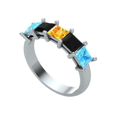 Sitrin, siyah zirkon ve akuamarin 14 ayar beyaz altın yüzük