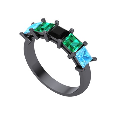 Siyah zirkon, yeşil kuvars ve akuamarin 925 ayar siyah rodyum kaplama gümüş yüzük